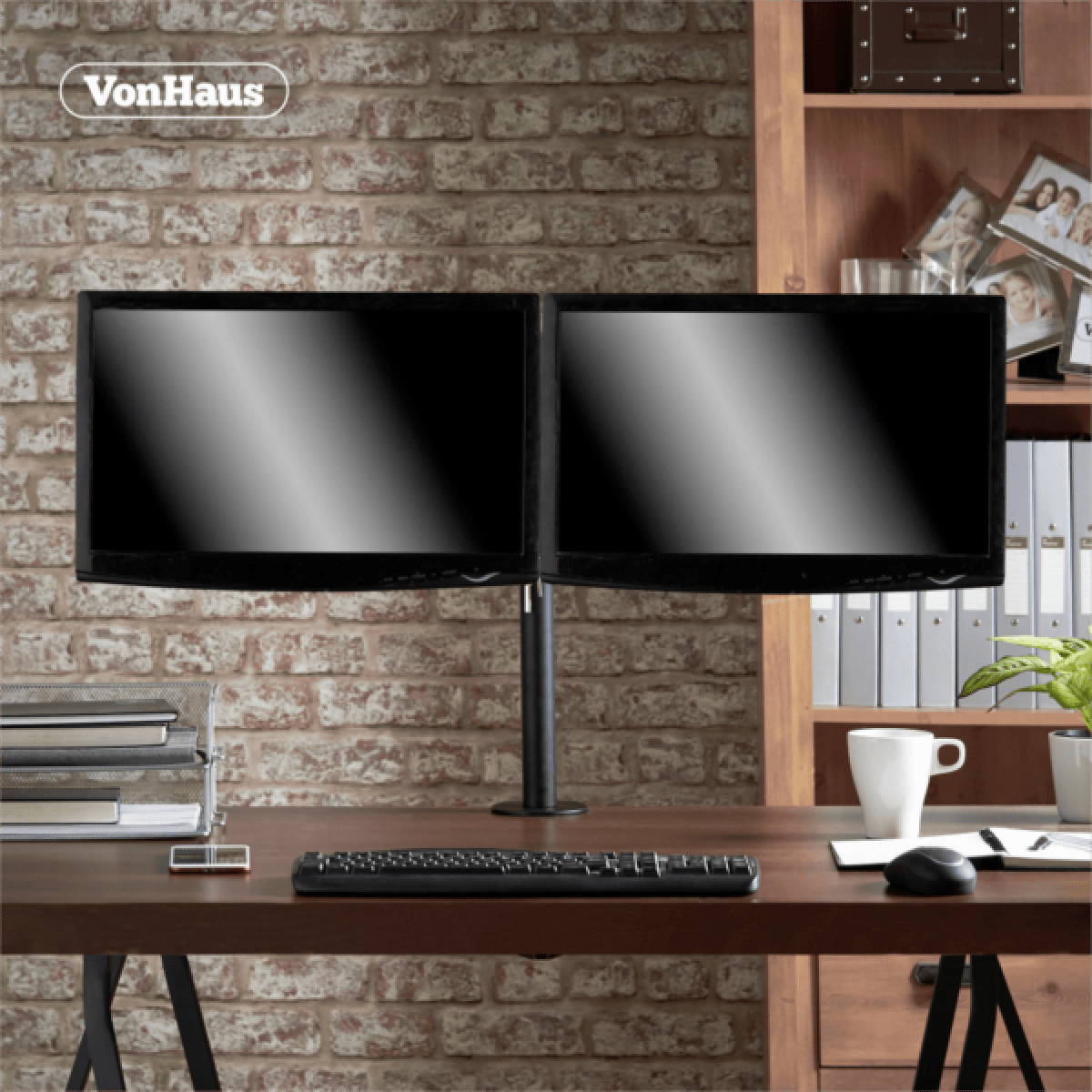VonHaus dvojni namizni nosilec je namenjen pritrditvi dveh monitorjev velikosti od 33 do 68,6 cm (13'' do 27''). Nato ju lahko posebej nagibate, zasukate ali rotirate. Odlikuje ga ročica, ki si iztegne do 42,8 cm. Opremljen je z VESA nastavki in podpira tako VESA 75 × 75 kot tudi VESA 100 × 100 standard. V dobavi je priloženo tudi orodje za montažo.