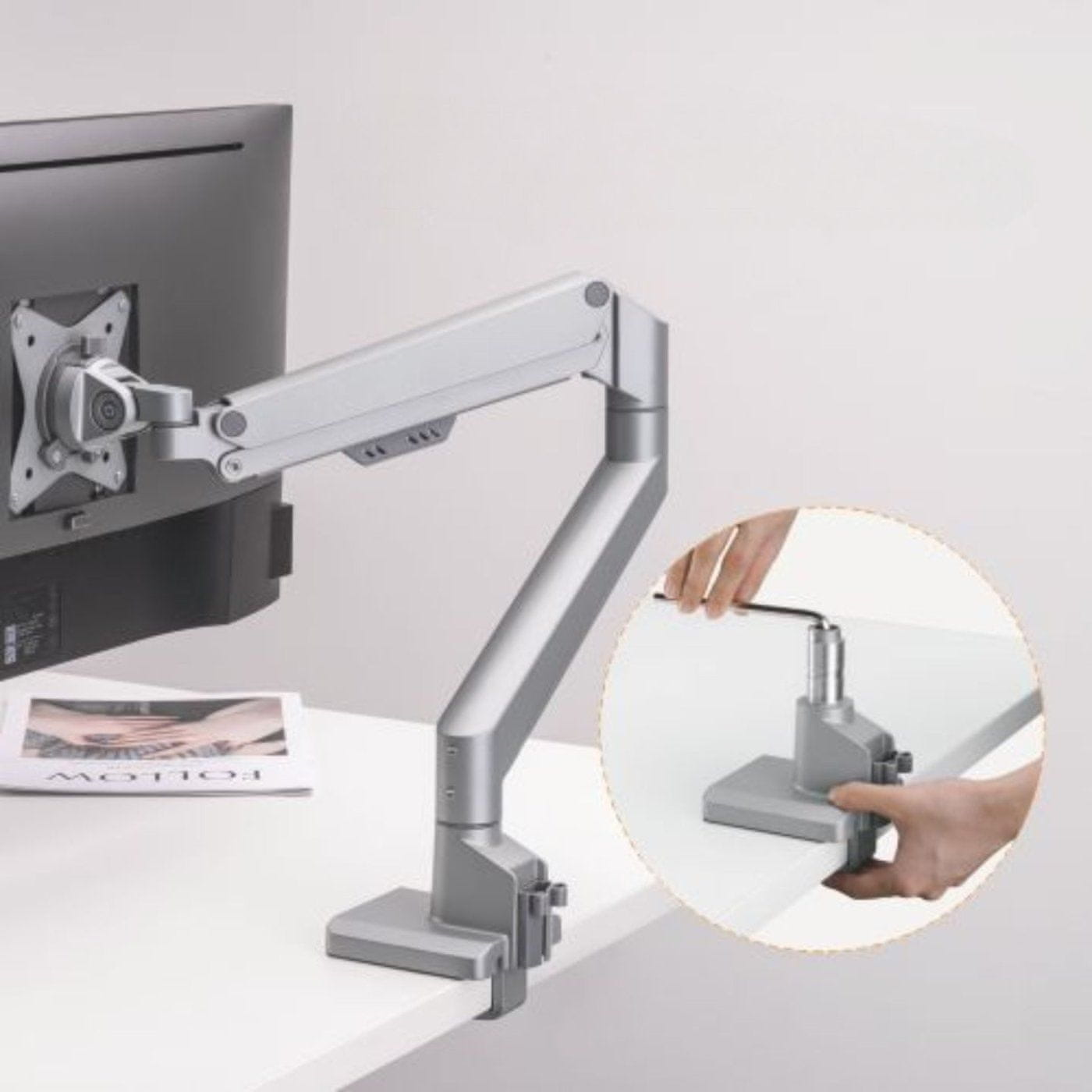 Glavne značilnosti. Snemljiva plošča VESA omogoča enostavno namestitev monitorja – Vgrajeni mehanizem plinske vzmeti omogoča popolno prilagoditev togosti roke glede na težo monitorja – Univerzalna združljivost: ta namizni nosilec je združljiv z večino monitorjev velikosti od 17" do 32" palcev in s standardi VESA 75×75 mm in 100×100 mm. Ne glede na to, ali uporabljate monitor LCD, LED ali OLED, bo nosilec za monitor Brateck zagotovil varno in stabilno namestitev – Vgrajen sistem vponk za enostavno organizacijo vodenja kablov – Trpežna konstrukcija: nosilec je izdelan iz kakovostnega materiala, ki zagotavlja stabilnost in vzdržljivost – Enostavna namestitev: nosilec je opremljen s popolnim montažnim priborom, zato ga boste na mizo namestili v nekaj minutah. Enostavna montaža z 10–50 mm debelo ploščno objemko ali 10–45 mm debelo ploščno vponko.