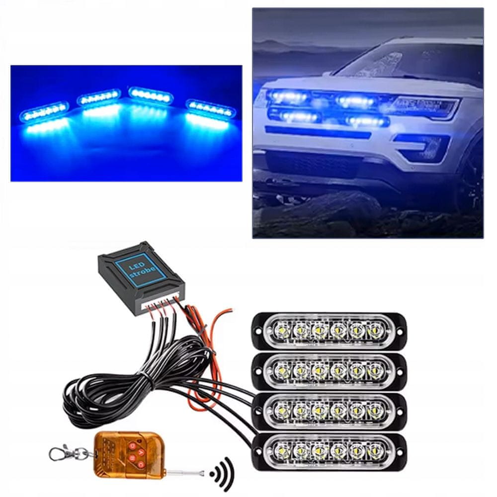 4× MODRA LED UTRIPAJOČA OPOZORILNA LUČKA DALJINSKI UPRAVLJALNIK STROBOSKOPSKI PROGRAMI Celoten opis