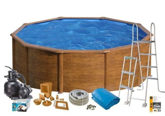 Bazenski komplet vsebuje vso opremo za njegovo namestitev: jekleno steno v imitaciji lesa, skimer s povratno šobo, peščeni filter s predfiltrom in varnostno lestev s podestom.