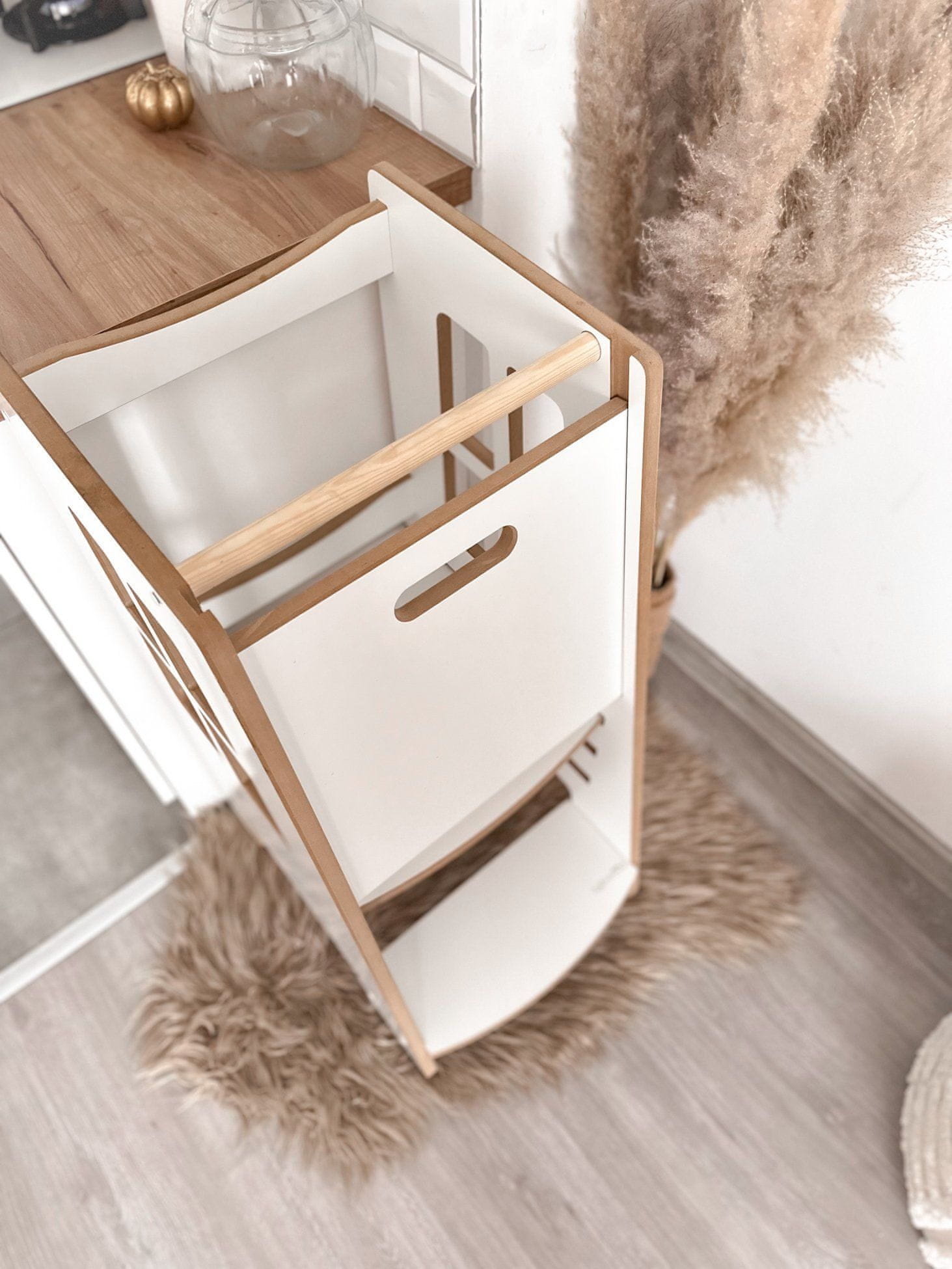 Kuhinjski pomočnik, ki ga predstavljamo, vsekakor izstopa od drugih modelov. Opremljen je z dodatno varnostno ploščo, zahvaljujoč kateri malček ne pade iz pohištva. To je rešitev, ustvarjena posebej za aktivne otroke. Konstrukcija pomagača je stabilna in trdna. Pomembno je, da lahko vaš otrok zlahka sam stopi nanj in sestopi. Dizajn pohištva je tudi izjemen – bela izgleda odlično v vsaki kuhinji!