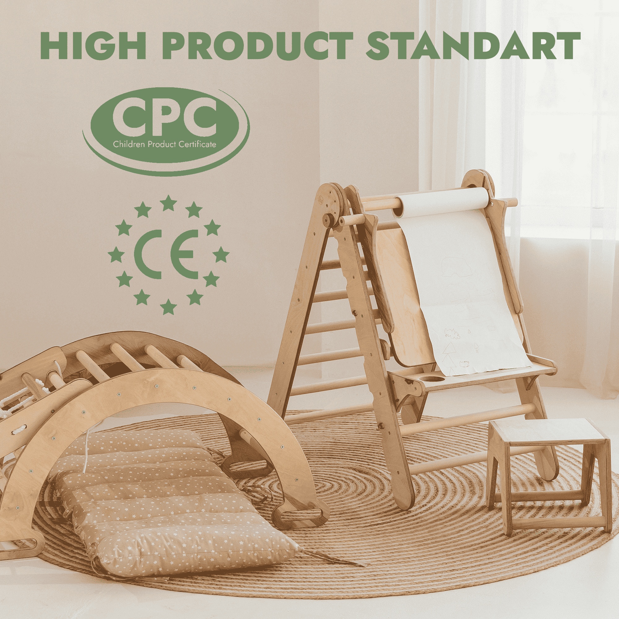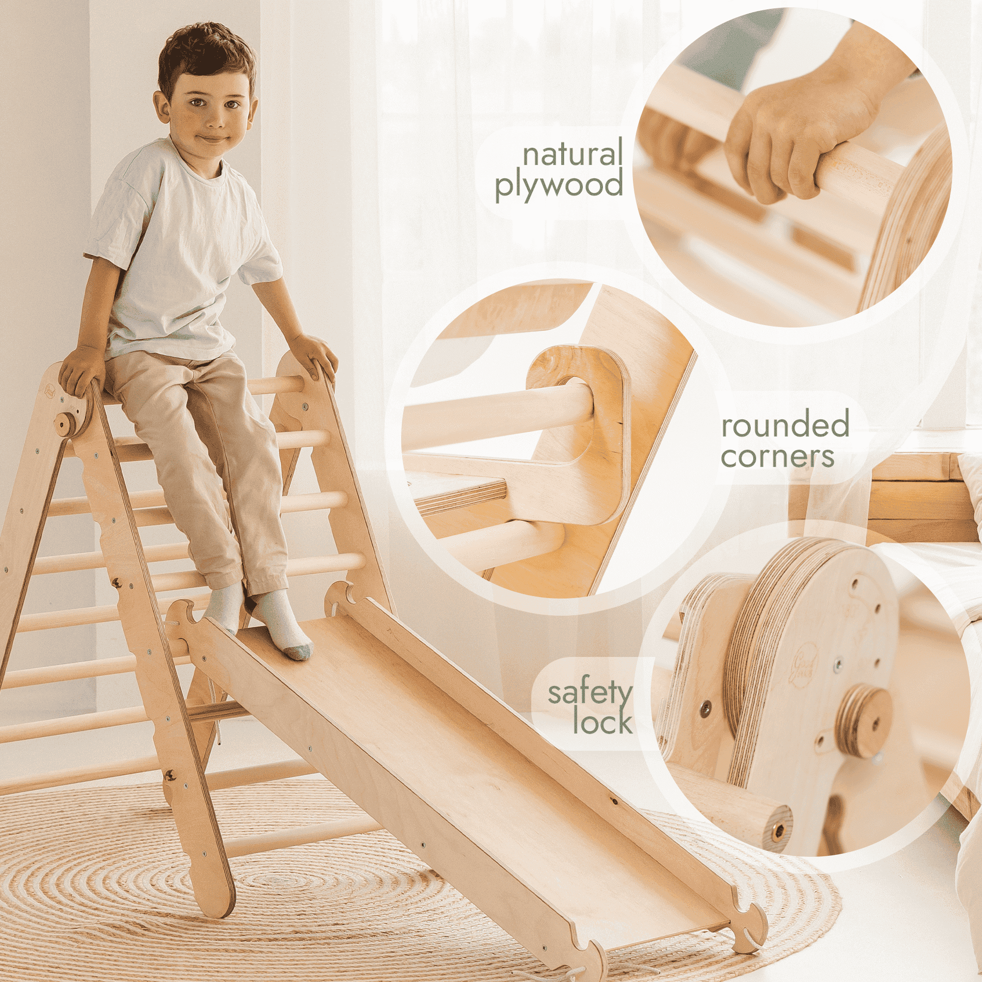 Visokokakovostni materiali: Naša plezalna igrala so izdelana iz latvijskega brezovega vezanega lesa in lipovega lesa ter zagotavljajo dolgotrajno zabavo brez tveganja za poškodbe zaradi trsk. Obdelana so z mešanico olj in voskov za uporabo v notranjih prostorih in pod nadzorom na prostem ter izpolnjujejo evropske varnostne standarde za igrače.