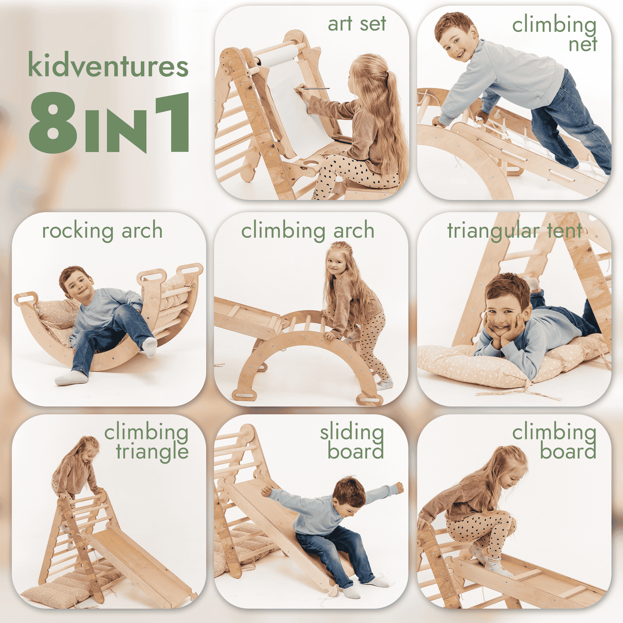 Montessori princip: Spodbuja telesni razvoj in motorične sposobnosti ter izboljšuje ravnotežje, moč in gibčnost skozi aktivno igro. Med funkcijami so trikotna lestev in plezalni lok za začetnike ter napredne možnosti.