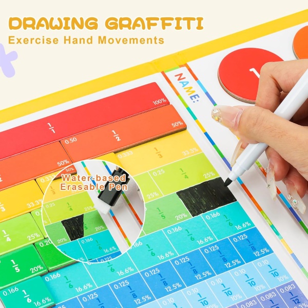 Vključuje 9 barvitih magnetnih krogov in pravokotnikov, ki olajšajo predstavljanje in razumevanje ulomkov.