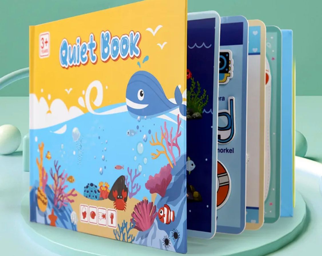 Meng Montessori Tiha knjiga - knjiga z nalepkami - Tiha knjiga - komplet 4 tihih knjig (dinozavri, potovanja, podvodni svet, vesolje)