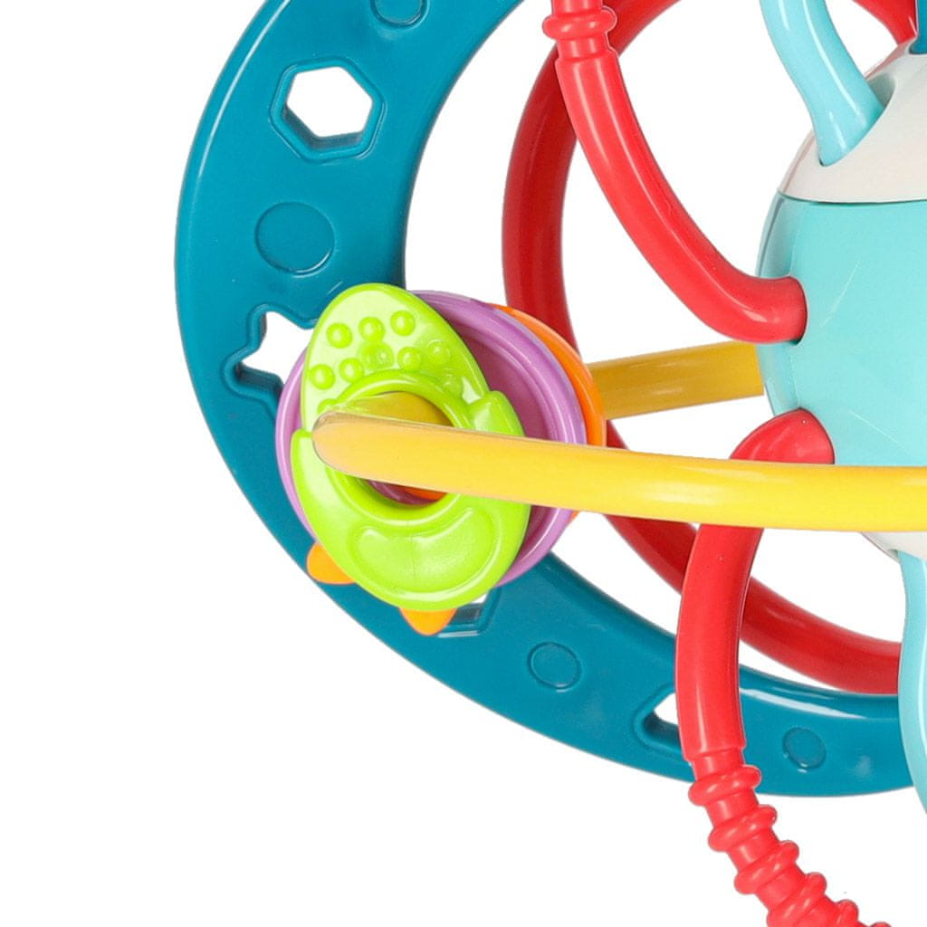 Raznolika površina grizala razvija občutek dotika. Ropotajoči elementi pa spodbujajo sluh. Živahne barve bodo pritegnile pozornost vašega dojenčka in razvile njegov vid.