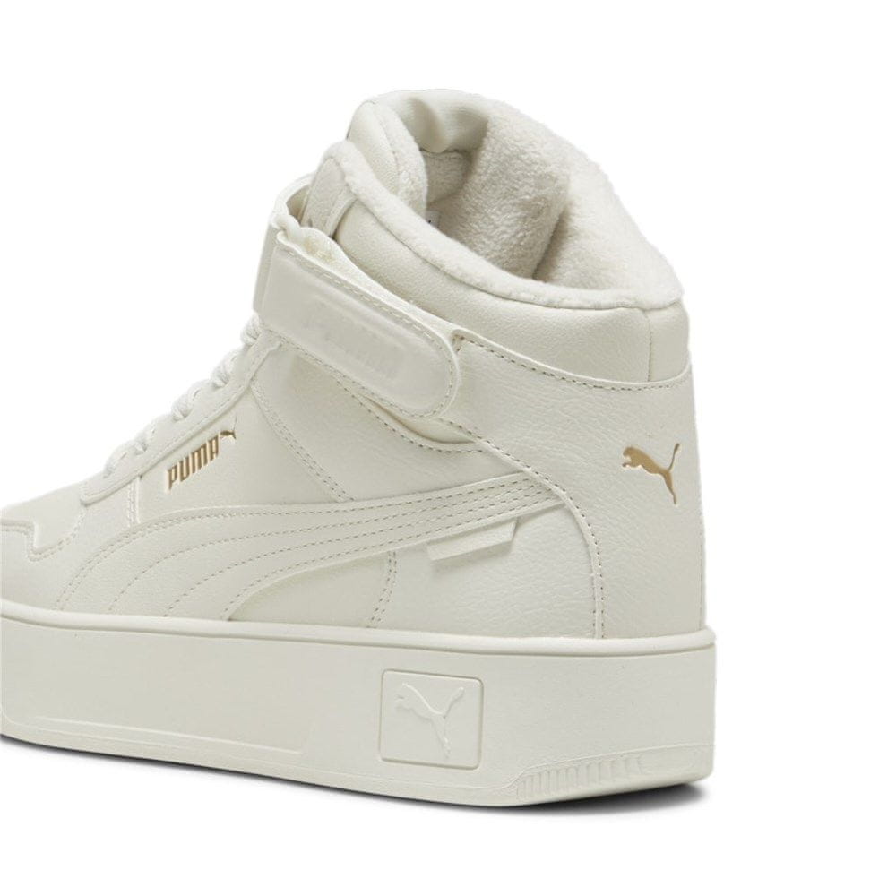 Puma Carina Street Mid WTR je eleganten in funkcionalen čevelj, ki združuje klasičen dizajn s sodobno tehnologijo ter ponuja udobje in oporo v vseh pogojih. Različica „Mid“ ima srednje visok zgornji del, ki zagotavlja stabilnost in dodatno zaščito gležnja. Zahvaljujoč tehnologiji WTR (Winterized) so čevlji primerni za hladnejše dni, njihov gumijast podplat s tekalno plastjo pa zagotavlja dober oprijem na spolzkih površinah.