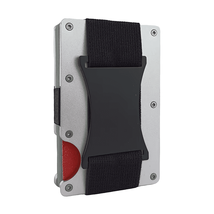 Minimalistična aluminijasta premium denarnica s črnim elastičnim pasom za denar. Celoten opis