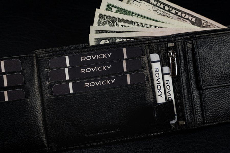 Kakovostna usnjena moška denarnica Ronaldo. Vodoravna oblika, brez zaponke. Med drugim je opremljena s sedmimi režami za kartice, petimi predali za dokumente in predalom z zadrgo na sredini.