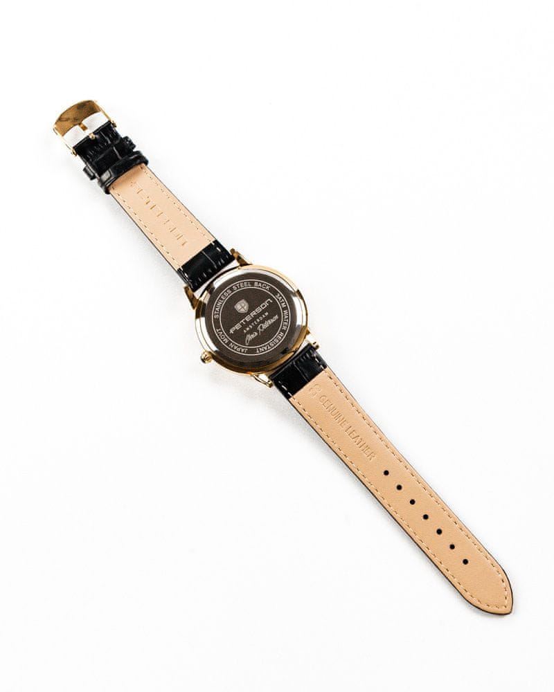 Ura ima čudovit, reliefni pašček iz visokokakovostnega črnega pravega usnja. Logotip blagovne znamke je na zaponki, številčnici in hrbtni strani ure.