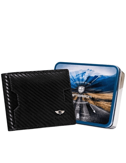 Še ena vrhunska denarnica Peterson, tokrat v minimalističnem slogu. S prelepim karbonskim vzorcem in kompaktnim dizajnom ponuja prostor za do 10 kartic ter skriti žep za kovance, ki se zapira z gumbom.
