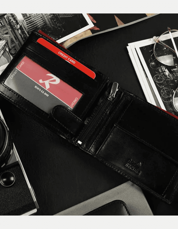 Prostorna klasična denarnica v elegantni črno-rdeči kombinaciji visokokakovostnega italijanskega usnja.