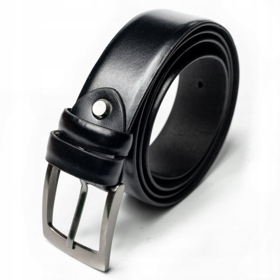 Ta pas je izdelan iz visokokakovostnega pravega črnega usnja s klasično, preprosto kovinsko zaponko.