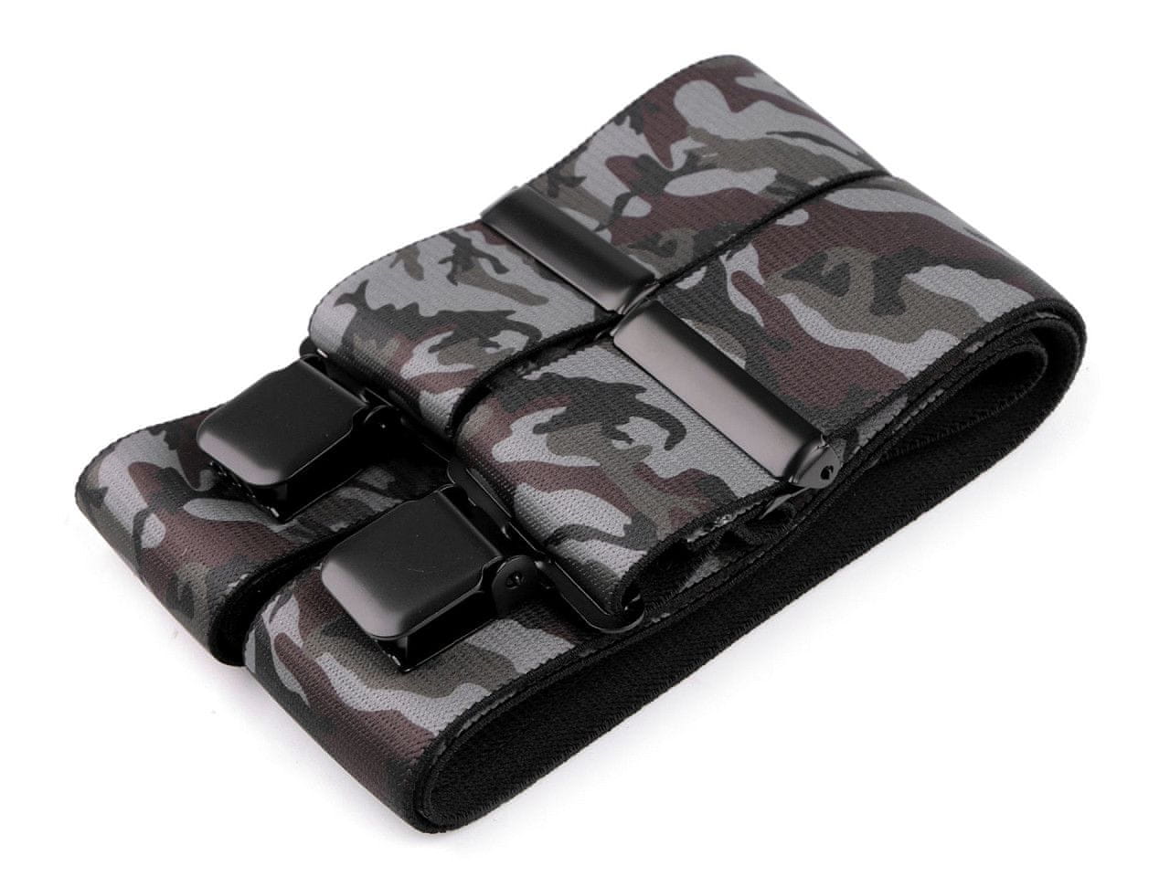 Podveze z maskirnim potiskom bodo všeč moškim, ki želijo biti dobro videti v mestu in na podeželju. Podvezice so običajno sestavni in praktični del njihovih oblačil. So visokokakovostne češke izdelave, elastičen material pa omogoča udobno nošenje. Zadajšnji vložek iz eko usnja jim daje eleganten videz. Na hlače se zapenjajo s tremi japonkami – dvema spredaj in eno zadaj.