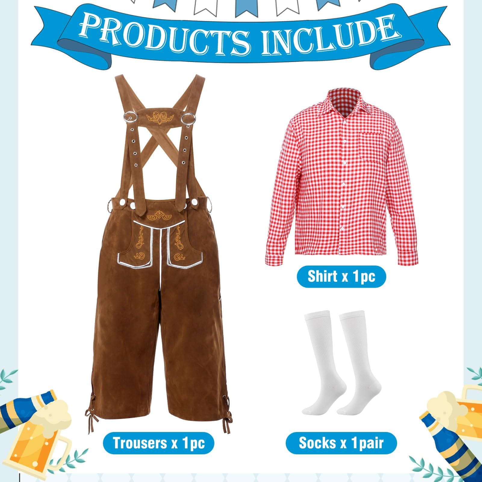 Tradicionalni moški komplet za Oktoberfest predstavlja elegantno in praktično izbiro za vse, ki cenijo avtentičen videz in udobje med praznovanjem. Usnjene hlače, rdeča srajca in dodatki tvorijo usklajeno celoto, ki omogoča polno vključitev v festivalsko dogajanje in ljudsko tradicijo. Izberite ta komplet za vaš naslednji dogodek in poskrbite za urejen videz v pravem bavarskem slogu.