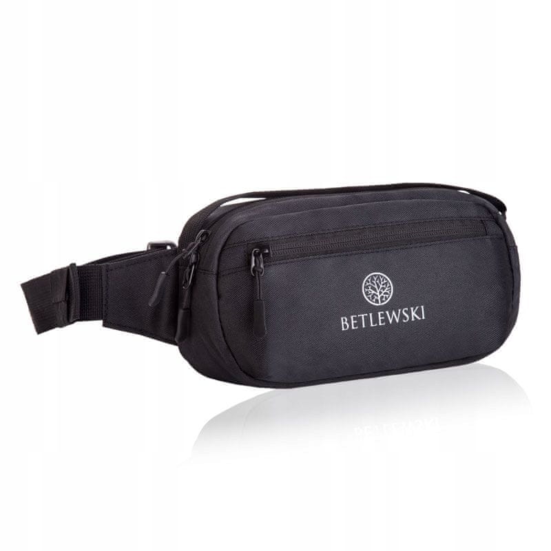 Na sprednji strani se nahaja praktičen žep z zadrgo, ki je idealen za predmete, do katerih potrebujete hiter dostop, kot so pametni telefon, vozovnice za javni prevoz ali parkirne karte. Na sprednji strani je natisnjen bel logotip Betlewski, ki poudarja športni in modni značaj torbe.