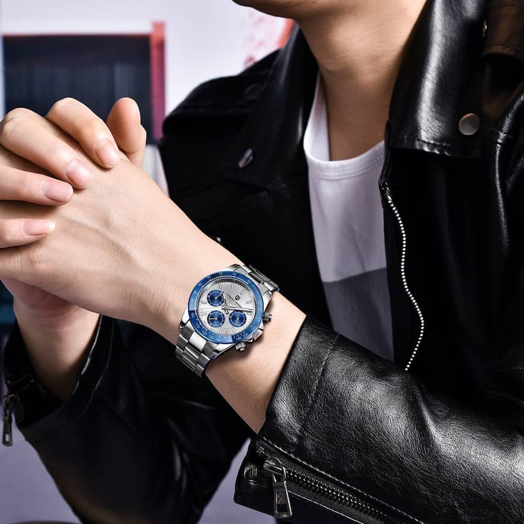 Ohišje ure je estetsko dovršeno in ga krasi tahimeter. Za super trdim kristaličnim Sapphire steklom pa je klasična številčnica, z elegantno razporejenimi kronografi in minimalističnimi urnimi kazalci.