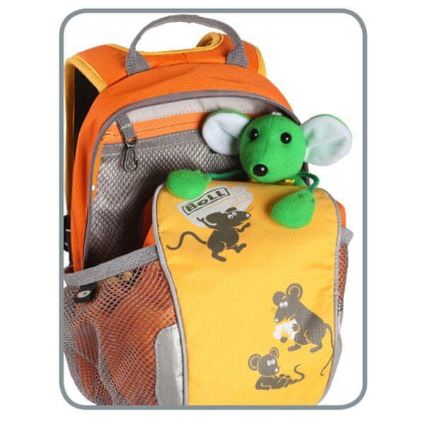 Prednosti:* anatomsko oblikovani naramnice s prsnim trakom in podloženim hrbtom za zdravo nošenje, * prsni trak je prilagojen anatomiji tudi subtilnega otroka, * prostornina in razporeditev žepov zagotavljata dovolj prostora za vse, kar potrebujete, * glavna komora z žepom iz mrežice z zadrgo, * številni varnostni odsevni elementi, * obdelava WR (vodoodbojna) na zunanjem materialu, * vključno s plišasto miško, PRIPOROČENO ZA OTROKE OD 90 CM DO 120 CM