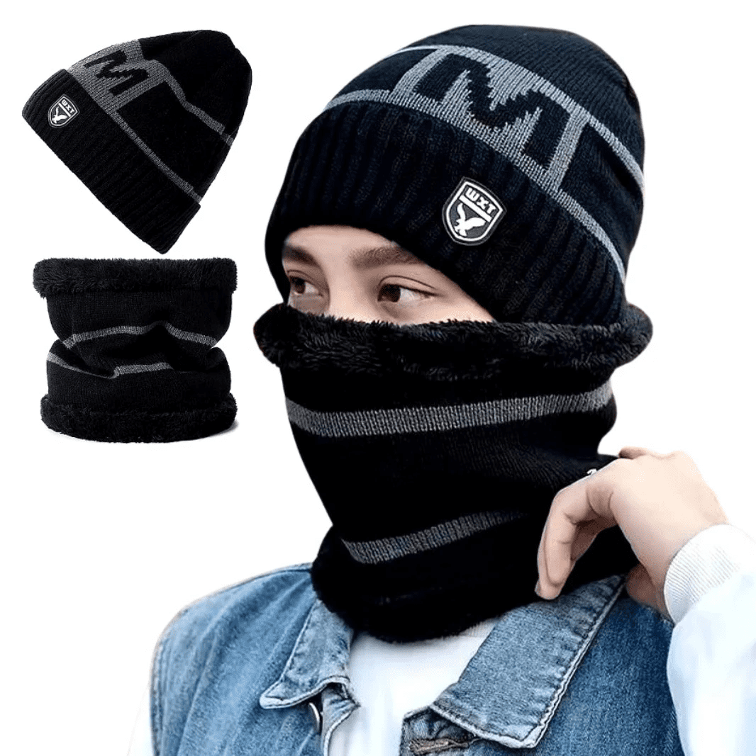 Zimski moški zazimljen komplet, ki se sestoji iz črne kape in kapice, je idealen dodatek za hladne in vetrovne dni. Narejen je iz 100% akrilne vlaknine, ki je izjemno elastična in ponuja odlično toplotno izolacijo. Kapa je univerzalne velikosti s obsegom 54–62 cm in je opremljena s toplim krznom, ki zagotavlja dodatno toploto. Eleganten dizajn s podolgovatimi črtami in velikim črkulim „M“ doda celotnemu videzu kanček stila, medtem ko zavihek nudi dodatno zaščito pred vetrom.