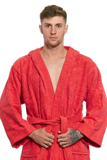 moška halja ima kapuco, dva žepa in pas za zavezovanje. Možen kopalni plašč