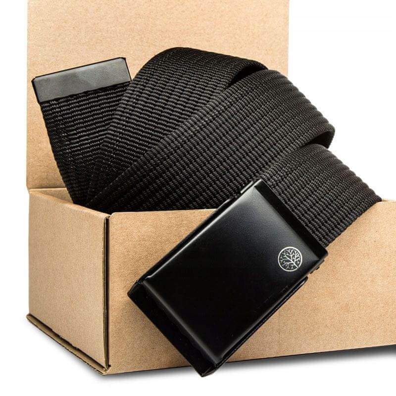 Pas se zapenja z močno kovinsko sponko, ki jo odlikuje edinstven in minimalističen dizajn. Na črni podlagi zaponke se nahaja diskreten logotip blagovne znamke – majhno drevo. Ta kombinacija združuje moderno estetiko s funkcionalnostjo, ki jo potrebujete v vsaki situaciji.