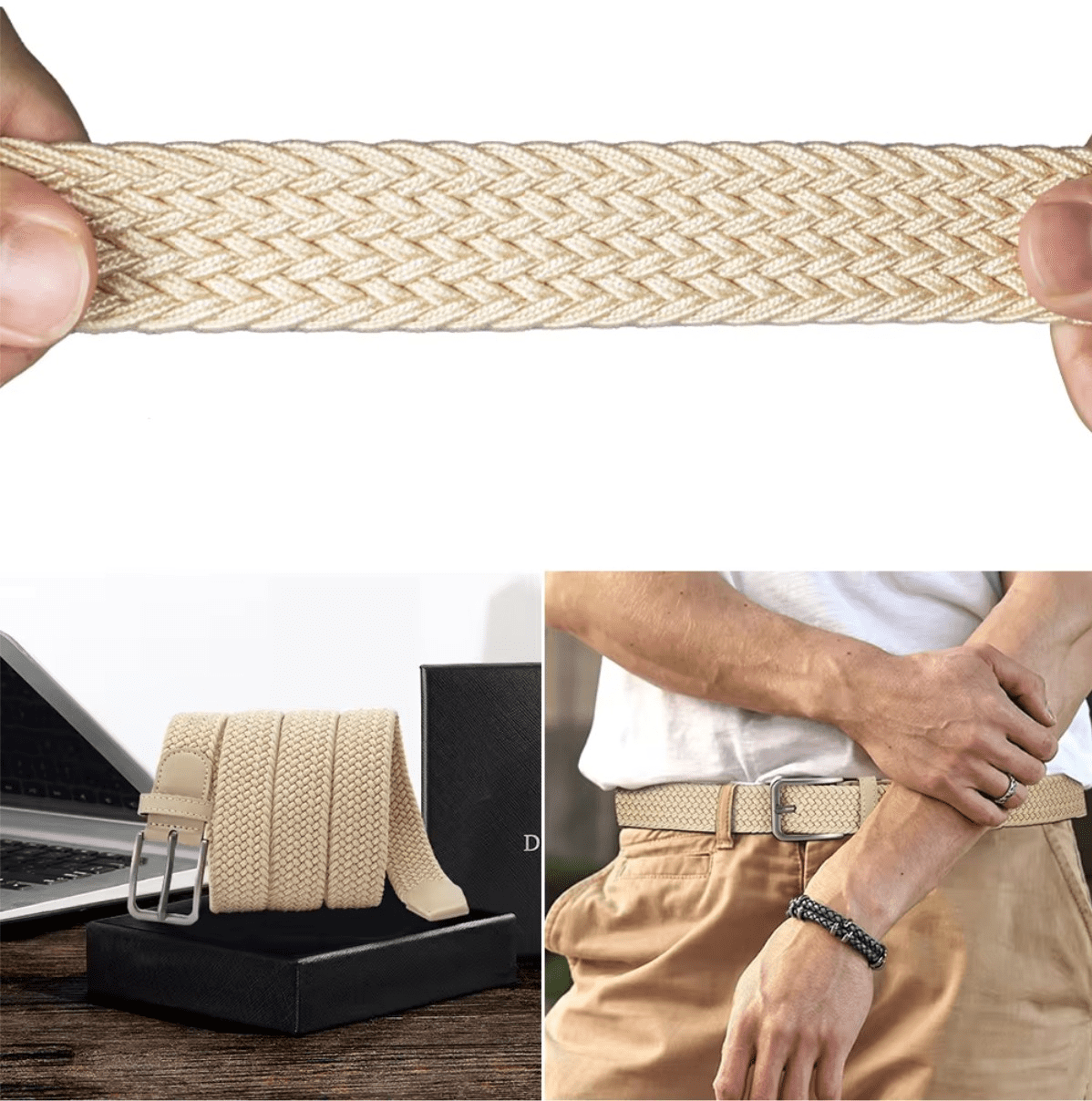 Uniseks elastični pas brez lukenj z elegantno srebrno zaponko je idealen modni dodatek za vsakogar, ki išče kombinacijo sloga in udobja. Izdelan iz elastičnega pletenega poliestra in ekološke kože, ta pas ponuja visoko kakovost in prožnost. Inovativna zasnova brez tradicionalnih lukenj omogoča prilagoditev po meri, kar zagotavlja udobno nošenje. Njegova univerzalna bež barva se enostavno kombinira z različnimi oblačili, kar ta pas dela idealnega za vsakodnevno nošenje in bolj formalne priložnosti.