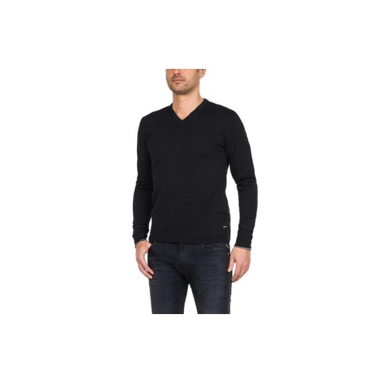 Pulover Replay z V-izrezom iz mešanice volne in bombaža. Ima rebraste manšete in kontrastne zaplate na komolcih.