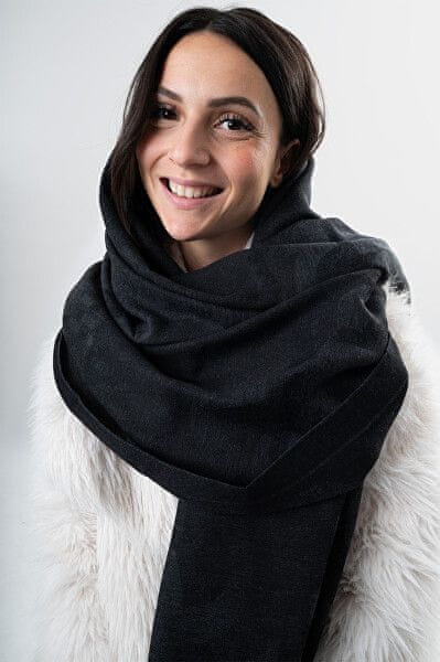 Črn šal Guess s subtilnim reliefnim logotipom v tonu tkanine. Na obeh koncih ima subtilne trepalnice za eleganten videz. Celoten opis