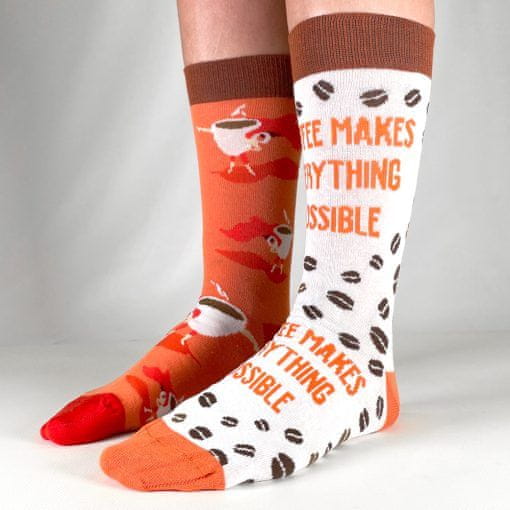 Te nogavice bodo takoj polepšale dan vsakemu ljubitelju kave. Na eni nogavici je vzorec z junakom Super-kavo, na drugi pa kombinacija kavnih zrn in spodbudnih napisov.