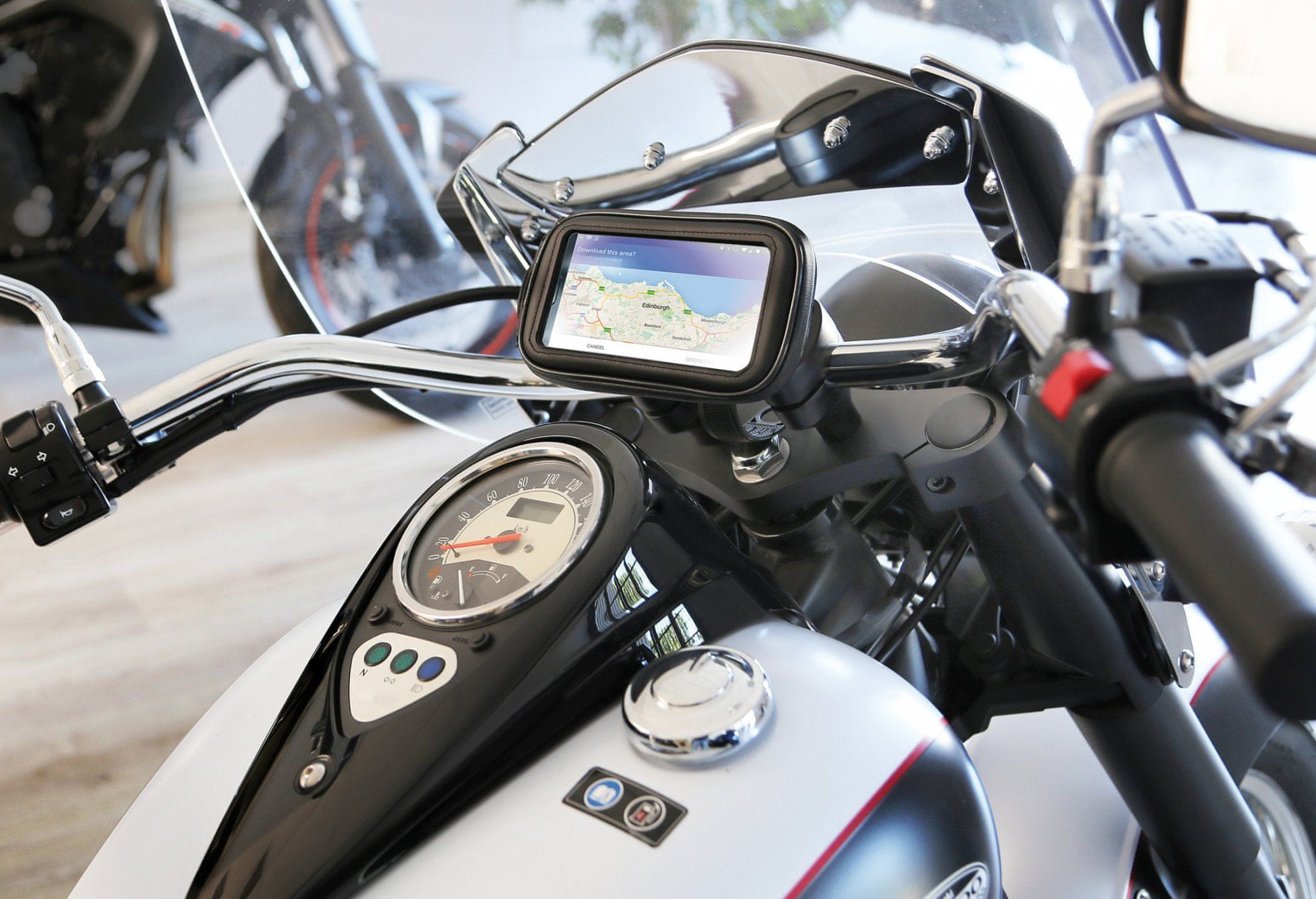 Večnamenski nosilec za telefon, dlančnik, navigacijo. Hitra pritrditev s posebno objemko s ključavnicami, primerno za premere krmila 20–48 mm. Celoten opis