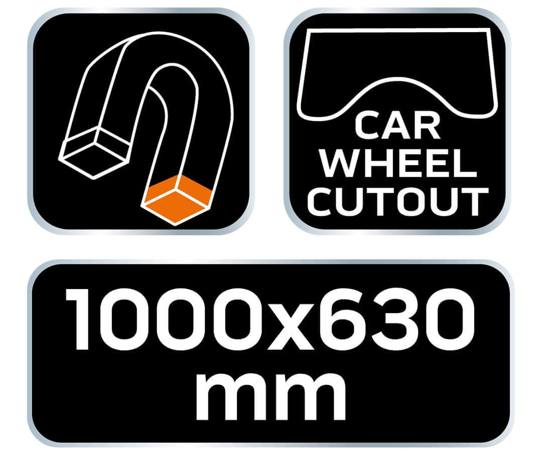 Magnetna podloga NEO (izrez za kolo) 11–719 je izdelek, zasnovan za zaščito blatnika s praktičnim izrezom za kolo med vzdrževanjem vozila. Podloga meri 1000 × 630 mm in ima magnetni nosilec za hitro namestitev. Izdelana je iz vodoodpornih in oljeodpornih materialov, ščiti avtomobil pred madeži od olja in masti ter zmanjšuje tveganje za praske laka. Magnetna podloga NEO je priporočljiva za avtomobilske delavnice.