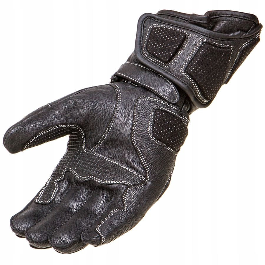 Naše rokavice nudijo dolgotrajno udobje, tudi več ur zapored. To je zasluga popolnoma strojenega, visokokakovostnega govejega usnja, mehke podloge in anatomsko oblikovanega kroja. Trdi ščitniki za členke in prste skupaj s penastimi blazinicami na dlani in manšeti učinkovito ščitijo pred padci in udarci, dva močna ježka na manšeti (en širok in en tanek v višini zapestja) pa ne le omogočata, da rokavice prilagodite svojim potrebam, temveč tudi učinkovito preprečujeta, da bi vam zdrsnile z roke. Velika protizdrsna plošča na dlani (vzdolž palca in kazalca ter na dnu prstov) prav tako igra pomembno vlogo pri varnosti. To zagotavlja varen oprijem krmila v vseh vremenskih razmerah.