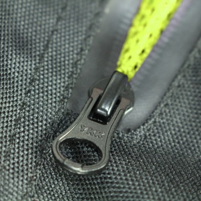 Zaščito voznika v primeru padca ali nesreče zagotavljajo odstranljivi gumijasti ščitniki za kolena in boke. Drugi varnostni element je zadrga za povezavo z jakno in odsevni elementi.