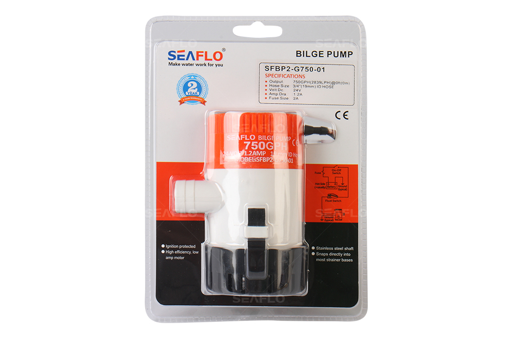 Seaflo SFBP1-G750–01 je električna drenažna črpalka z zmogljivostjo do 47 litrov na minuto in zmožnostjo dviga vode do višine 2,5 metra. Ohišje, izdelano iz močne ABS plastike, je popolnoma zaprto, kar omogoča varno delovanje črpalke, ko je popolnoma potopljena. Podstavek črpalke je enostavno odstraniti, kar omogoča enostaven dostop do odprtine za dovod vode. Opremljena je s tihim, dolgo vzdržljivim motorjem in rotorjem, ki deluje brez prekomernih vibracij, ter sistemom zračnih zapor. Uporablja se v čolnih in jahtah, pa tudi v medicini, laboratorijih in solarnih vodnih sistemih. Zagon črpalke ni samodejen in zahteva uporabo dodatnega električnega stikala ali avtomatskega stikala s plovcem.