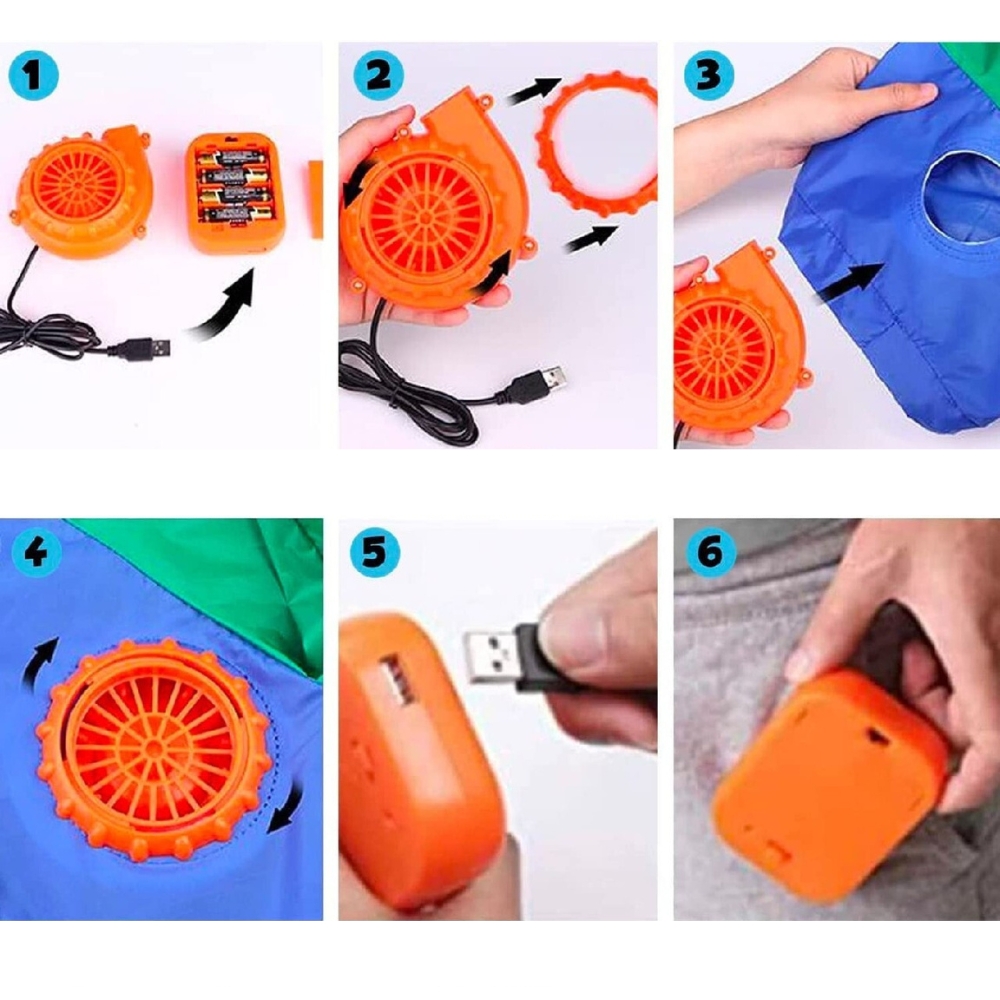 Vendar vam ni treba skrbeti, da bi vam zmanjkalo energije! Komplet vključuje tudi USB kabel , ki vam bo omogočil napihovanje kostuma s pomočjo prenosne baterije .