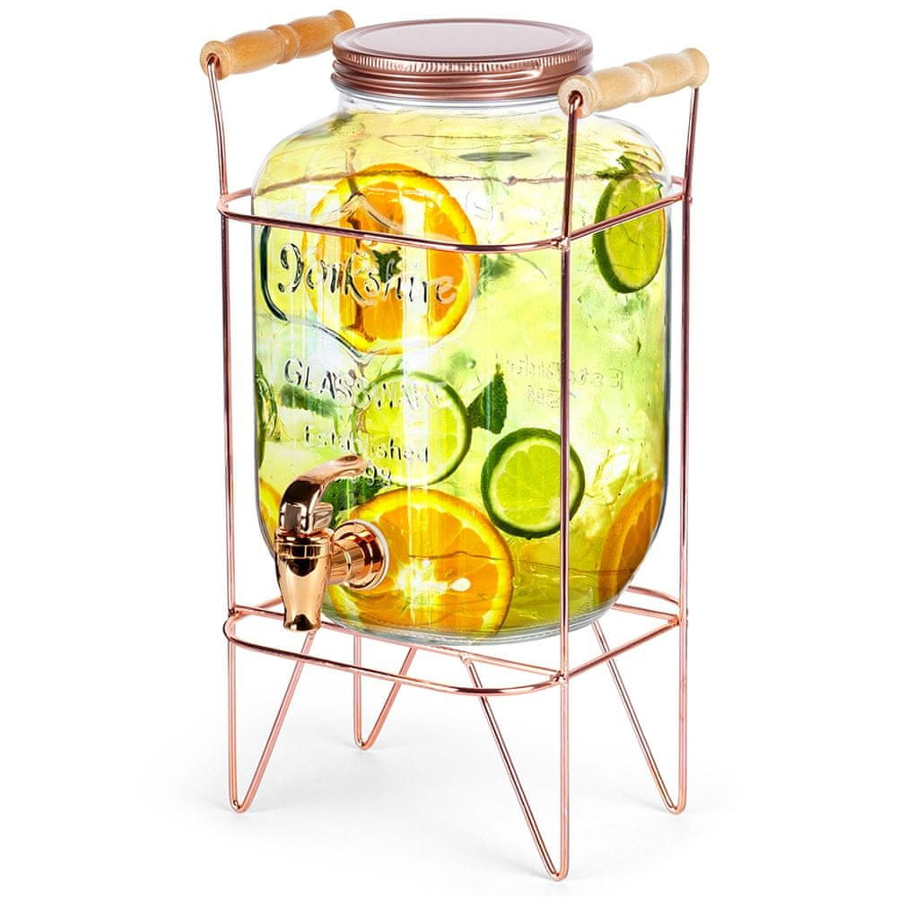 Ta komplet je sestavljen iz kozarca s pipo in stojala za kozarce. Popoln za postrežbo vode, limonade, soka, ledenega čaja, vode z okusom in celo punča. Pipa olajša postrežbo vaših najljubših pijač na impresiven način. Kozarec s stojalom lahko uporabljate tako na vrtu kot na družinskih srečanjih. Pokrov, ki ga je mogoče zakleniti, preprečuje, da bi insekti zašli v vašo pijačo. Izdelan je iz zdravju varnih materialov in živil. Ni primerno za vroče napitke. Opomba! Na embalaži so napačni podatki o kapaciteti, dejanska kapaciteta je kot je opisano zgoraj.