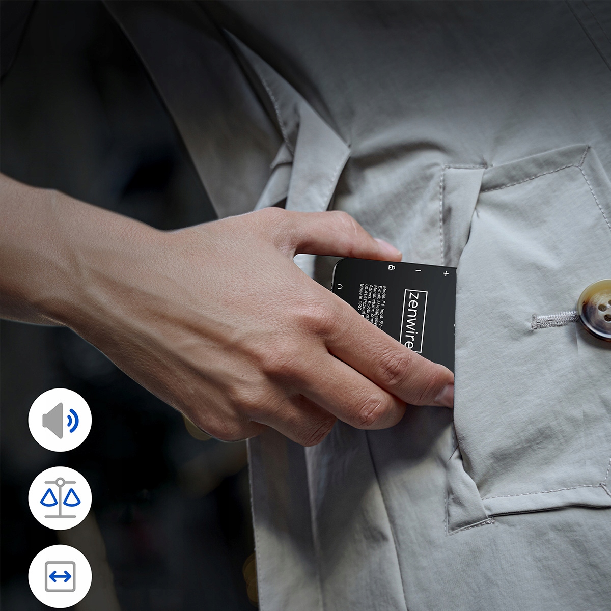 Predvajalnik MP3/MP4 Zenwire tehta le 80 g, njegove vitke dimenzije (75 × 52 × 12 mm) pa pomenijo, da ga lahko enostavno shranite v žep, torbo ali nahrbtnik.