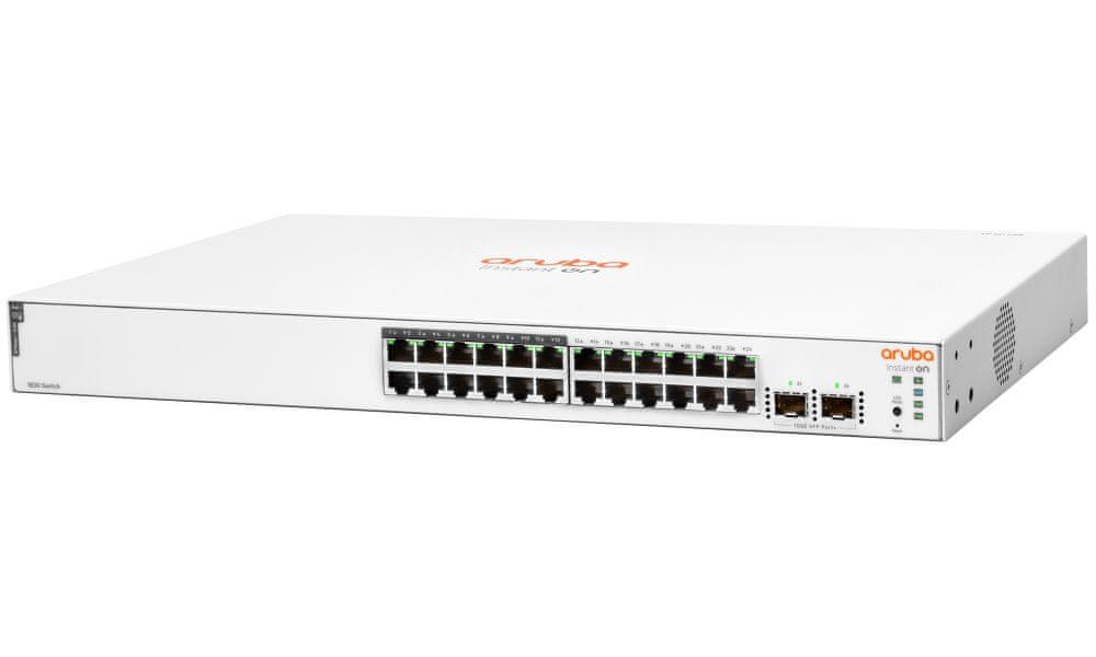Upravljivo stikalo PoE+, ki ponuja 24× 10/100/1000 Mb/s vrat RJ-45 (vključno z 12× RJ-45 s podporo PoE+ 802.3af/at) in 2× 1 GbE vrat SFP. Preklopna zmogljivost je 52 Gb/s, hitrost usmerjanja pa 38,68 Mpps. Glavne prednosti vključujejo enostavno ustvarjanje ločenih VLAN, QoS ali IGMP Snooping. Serija Aruba 1830 ponuja uporabniku prijazen spletni vmesnik ali mobilno aplikacijo za enostavno konfiguracijo in upravljanje.