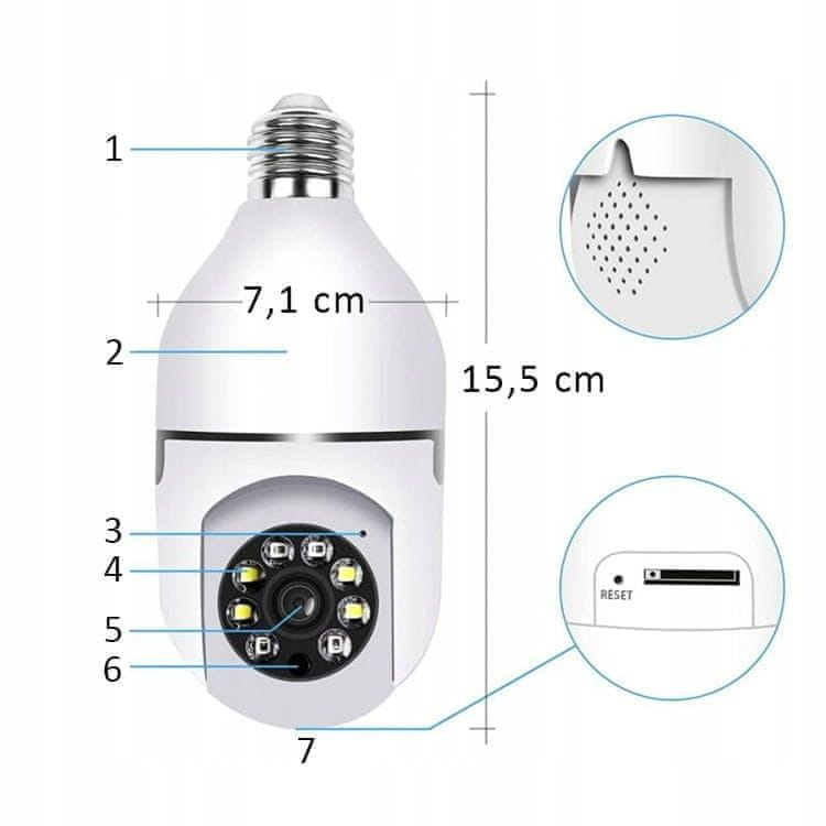 Zahvaljujoč WiFi kameri v obliki žarnice boste zavarovali svoj dom kot še nikoli doslej. Zahvaljujoč najnovejši tehnologiji je bilo mogoče v majhno žarnico z navojem E27 (združljivo z večino svetilk) vgraditi optiko, ki snema sliko v kakovosti 2 Mpx. Napravo upravljamo z nivoja aplikacije, ki jo enostavno prenesete na svoj telefon. Odslej lahko tudi ob odhodu na dopust nadzirate dogajanje v vašem domu!