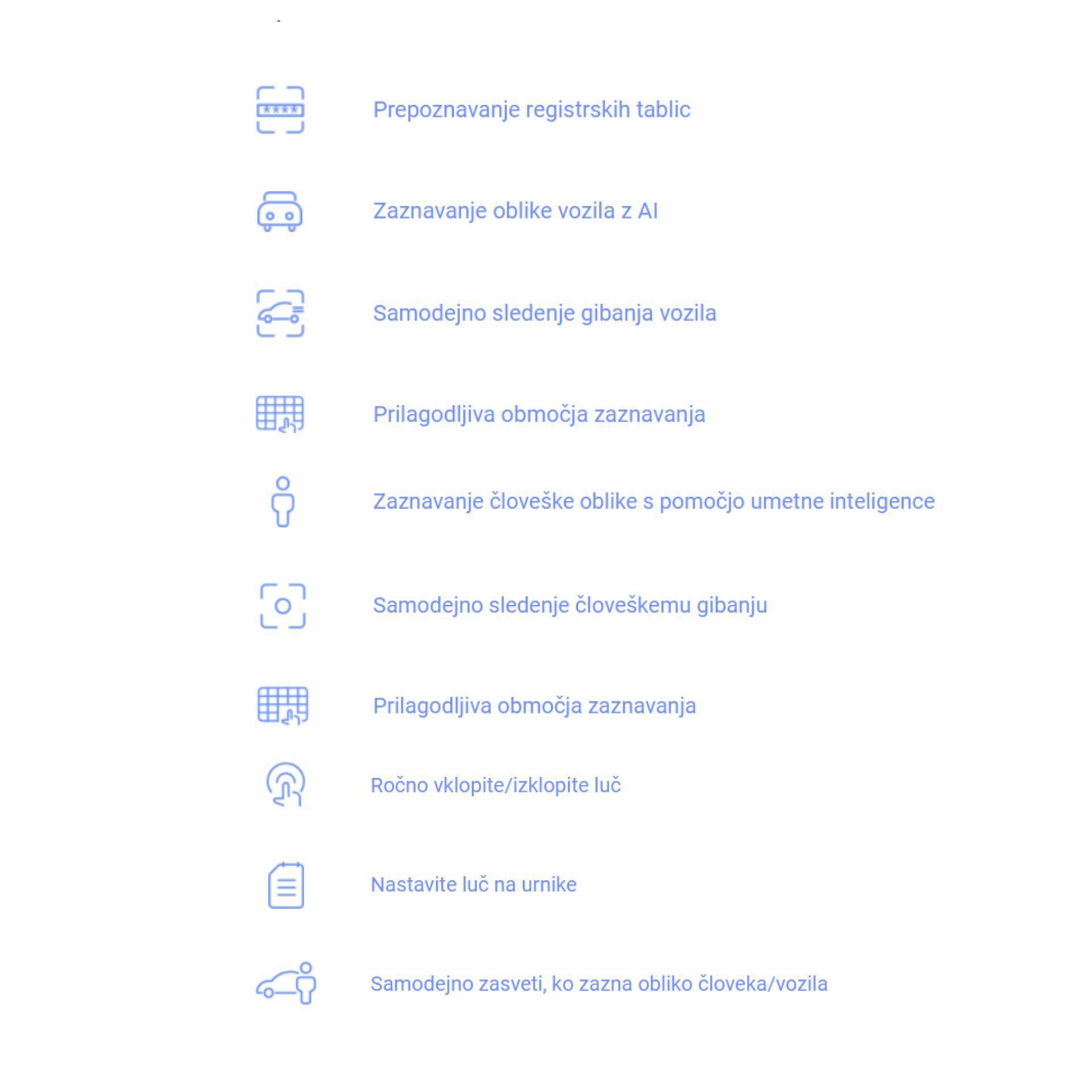 Način osvetlitve: Ročno, razpored, zaznavanje ljudi, zaznavanje vozil