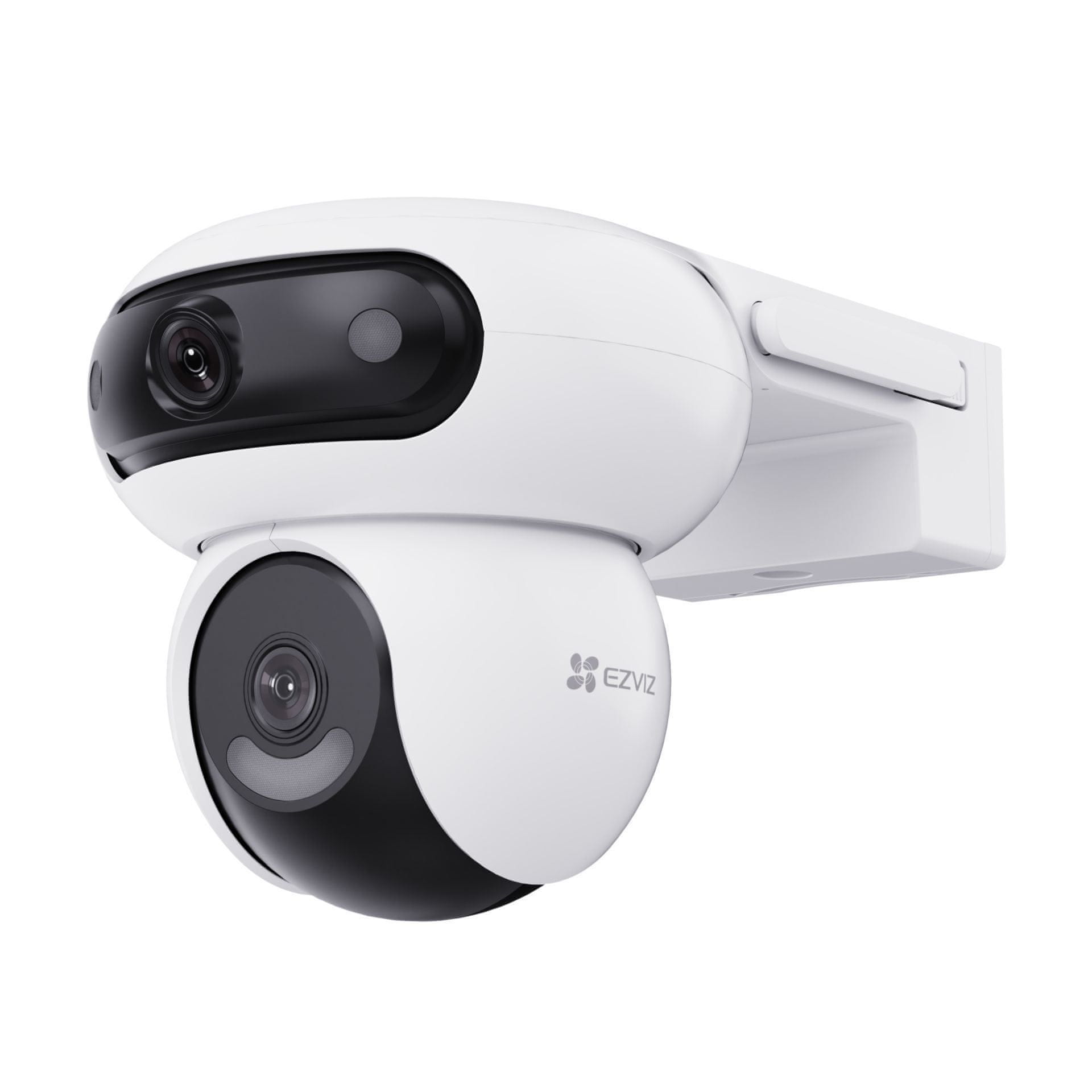 EZVIZ H90 Dual je inovativna zunanja IP kamera z dvema rotirajočima lečama, ki omogočata istočasno nadzorovanje dveh širokih območij ali podrobnejše snemanje iste dejavnosti. Sistem z tremi motorji omogoča gladko premikanje obeh kamer in zmanjšuje slepe kote.