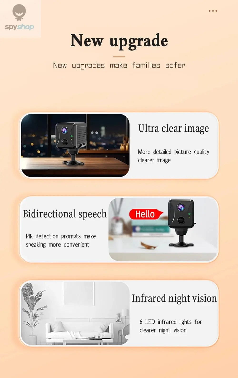 Ta kamera združuje senzor 1080P Full-HD s širokokotnim objektivom, da zajame več podrobnosti v vsakem kadru. Njena vsestranska brezžična nastavitev pomeni, da lahko uporabljate WiFi doma ali vstavite SIM-kartico za oddaljene lokacije, kar vam omogoča praktično pokritost na mestih, kot so lope, garaže, vhodi, mala podjetja ali parkirana vozila.