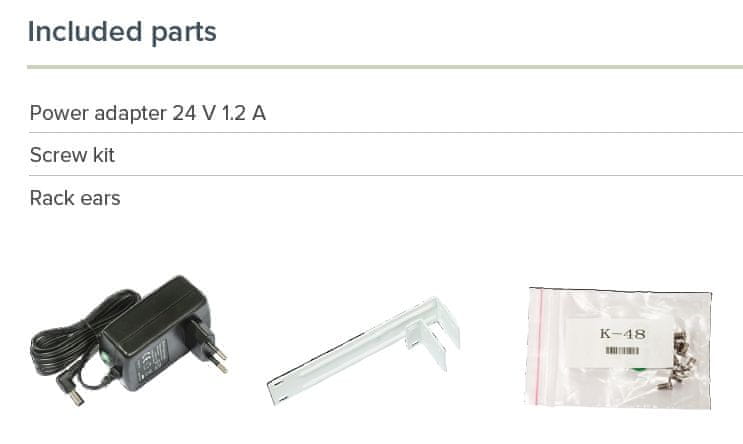 8× vrata SFP+ – 1× ethernetna vrata za upravljanje s PoE – Preklopna zmogljivost: 162 Gb/s – Največja poraba energije: 19 W (s priključki 33 W) – Podpira PoE+ IEEE 802.3at/af in pasivni PoE 18–57 V – Kovinsko ohišje – Brez ventilatorjev