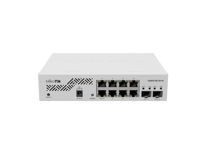 MikroTik CSS610–8G-2S+IN z dvemi SFP+ vrati za 10 Gigabitno optično povezljivost in 8× Gigabit Ethernet povezavo. Nameščen operacijski sistem SwOS. Celoten opis