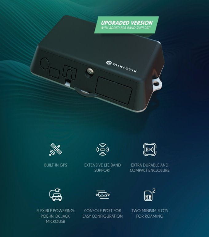 Naprava podpira najbolj priljubljene pasove LTE (vključno z B28). Ima dve notranji anteni LTE s u.FL priključki, ki ju lahko zamenjate z zunanjo anteno za boljšo pokritost. Vgrajeni GPS-modul omogoča sledenje položaju v realnem času in je združljiv s priporočeno zunanjo anteno ACGPSA. Naprava ima 2 reži za kartice SIM, vrata Ethernet in zaporedna vrata RS232.