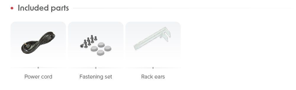 Spreklopnik Cloud Smart Switch vključuje operacijski sistem SwOS. V paketu so vključeni L-profili za namestitev v stojalo in napajalni kabel.