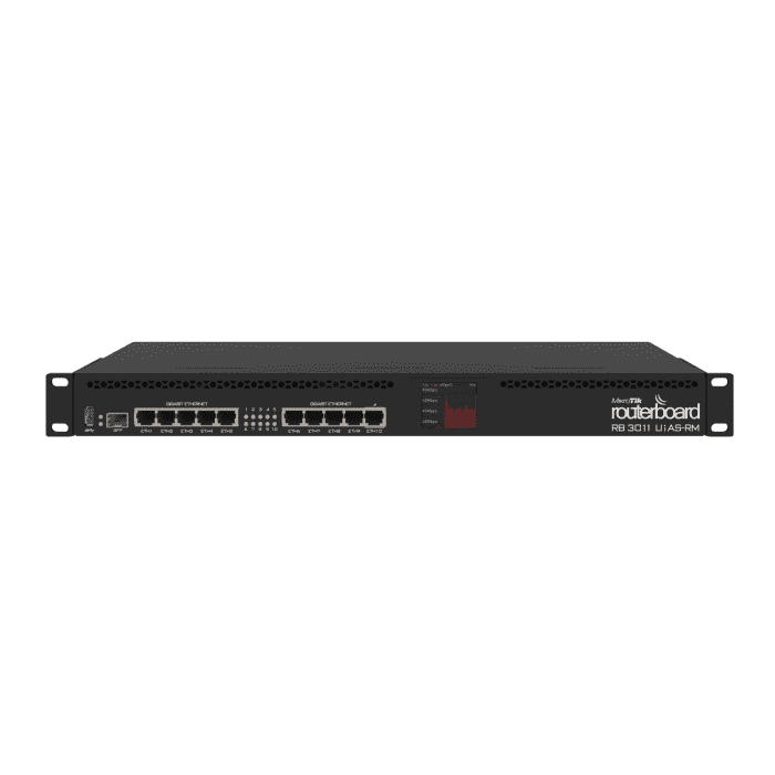 Enota RB3011UiAS-RM je opremljena z ohišjem za montažo v omaro 1U, LCD zaslonom na dotik, vrati za serijsko konzolo in izhodno funkcijo PoE na zadnjih vratih Ethernet.