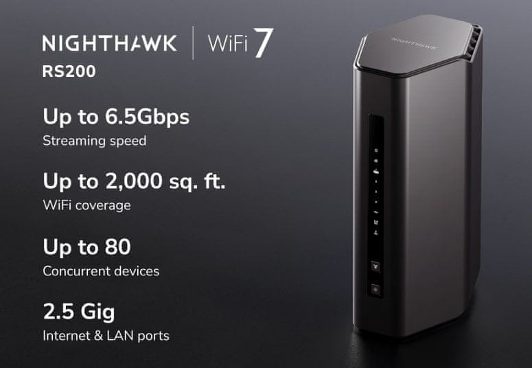 WiFi 7 vodilnega na področju inovacij WiFi – Nighthawk WiFi 7 temelji na več kot 25 letih pionirskih inovacij in je natančno izdelan po strogih NETGEAR-jevih standardih kakovosti, zato lahko uživate v vseh prednostih, ki jih ponuja WiFi 7. Večgigabajtni WiFi – Neprimerljive hitrosti WiFi 7 do 6,5 Gb/s za igre, tekoče pretakanje, videokonference in zabavo. Več zmogljivosti za podatkovno intenzivne dejavnosti – Povežite do 80 naprav, kot so varnostne kamere, pametne domače naprave in zvočniki, ter uživajte v neverjetnem pretakanju videa 4K, spletnem igranju in videokonferencah. Večgigabajtne hitrosti z internetnimi vrati 2,5GbE – Izkoristite internetna vrata 2,5GbE za kabelske in optične načrte s hitrostmi do 2,5 Gb/s. Združljiv s katerim koli ponudnikom internetnih storitev. Kabelski priključek 2,5 GbE in več- Povežite žične naprave in povečajte zmogljivost z 2,5Gb/s ethernetnim priključkom LAN in tremi 1Gb/s ethernetnimi priključki LAN. Široka pokritost – izjemno zmogljiv antenski niz zagotavlja pokritost do 2 500 kvadratnih metrov. Aplikacija Nighthawk – Enostavno nastavite usmerjevalnik, upravljajte omrežje od koder koli, zaustavite internet v povezanih napravah, hitro preizkusite hitrost interneta, spremljajte porabo internetnih podatkov, nastavite ločena omrežja za goste in še več. Obsežne funkcije – uporabite vmesnik USB 3.0 za deljenje datotek z vsemi povezanimi napravami, uporabite VPN za varen oddaljen dostop do domačega omrežja in še več