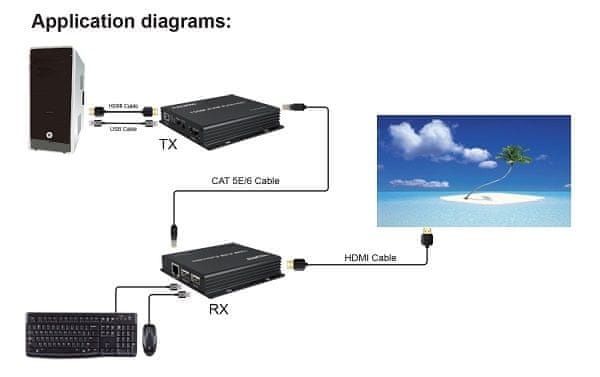 Naprava omogoča prenos signala HDMI in nadzora USB (tipkovnica, miška) ter IR do 150 m po enem omrežnem kablu.