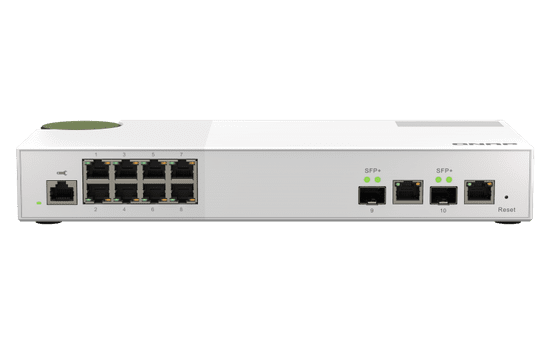 * Ponuja dve kombinirani 10GbE SFP+/RJ45 priključki. Združljiv je s tehnologijama 10GbE in NBASE-T, tako da podpira pet hitrosti (10G/5G/2,5G/1G/100M) z uporabo obstoječih kablov. Sistem *QNAP Switch System (QSS) je enostaven za uporabo in ima pregledno nadzorno ploščo, upravljanje vrat in čarovnika za nastavitev, zaradi česar je upravljanje osrednjega omrežja intuitivno. *Omogoča funkcije upravljanja na drugi plasti (kot so LACP, VLAN, ACL in LLDP), s katerimi lahko IT-osebje učinkovito upravlja pasovno širino omrežja in poveča varnost.